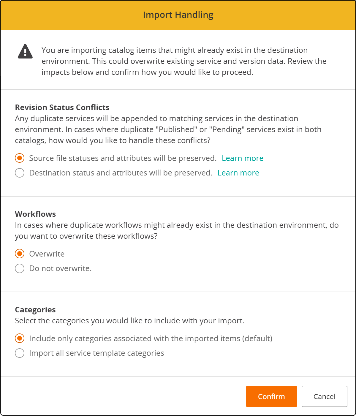 - In the Import Handling dialog, choose to preserve srouce attributes and overwrite existing workflows, then click