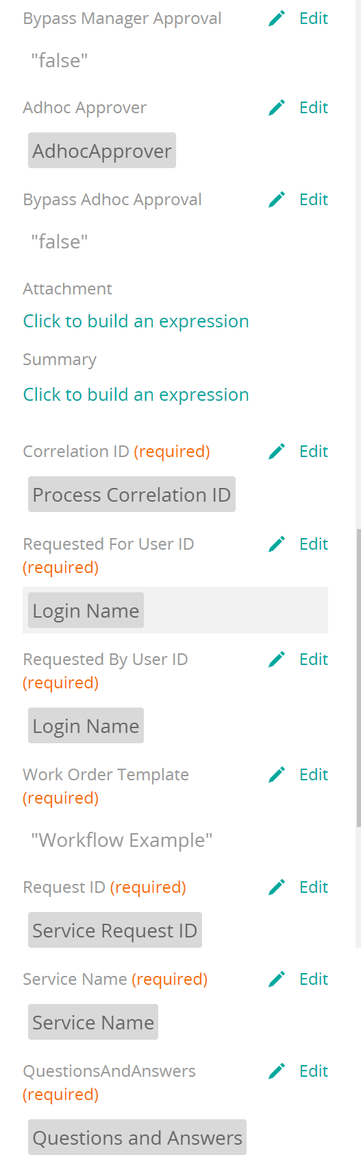 Work Order Templateproperty which needs to be the name of the work order template used for this request, the required fields can be populated with values from yourcontextvariable.